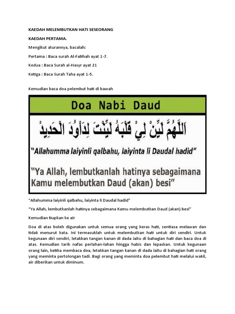 Doa berikut ini juga akan mengeluarkan aura dari seseorang. Misalnya saat ini anda tengah dilanda asmara dengan seseorang ingin melunakkan hati orang yang keras kepala dan lain sebagainya maka anda bisa mengamalkan doa pengasihan Nabi Daud di atas setelah solat subuh sebanyak 33 kali. Doa Melembutkan Hati Doa ini juga untuk meluluhkan hati orang yang kita cinta cintai.